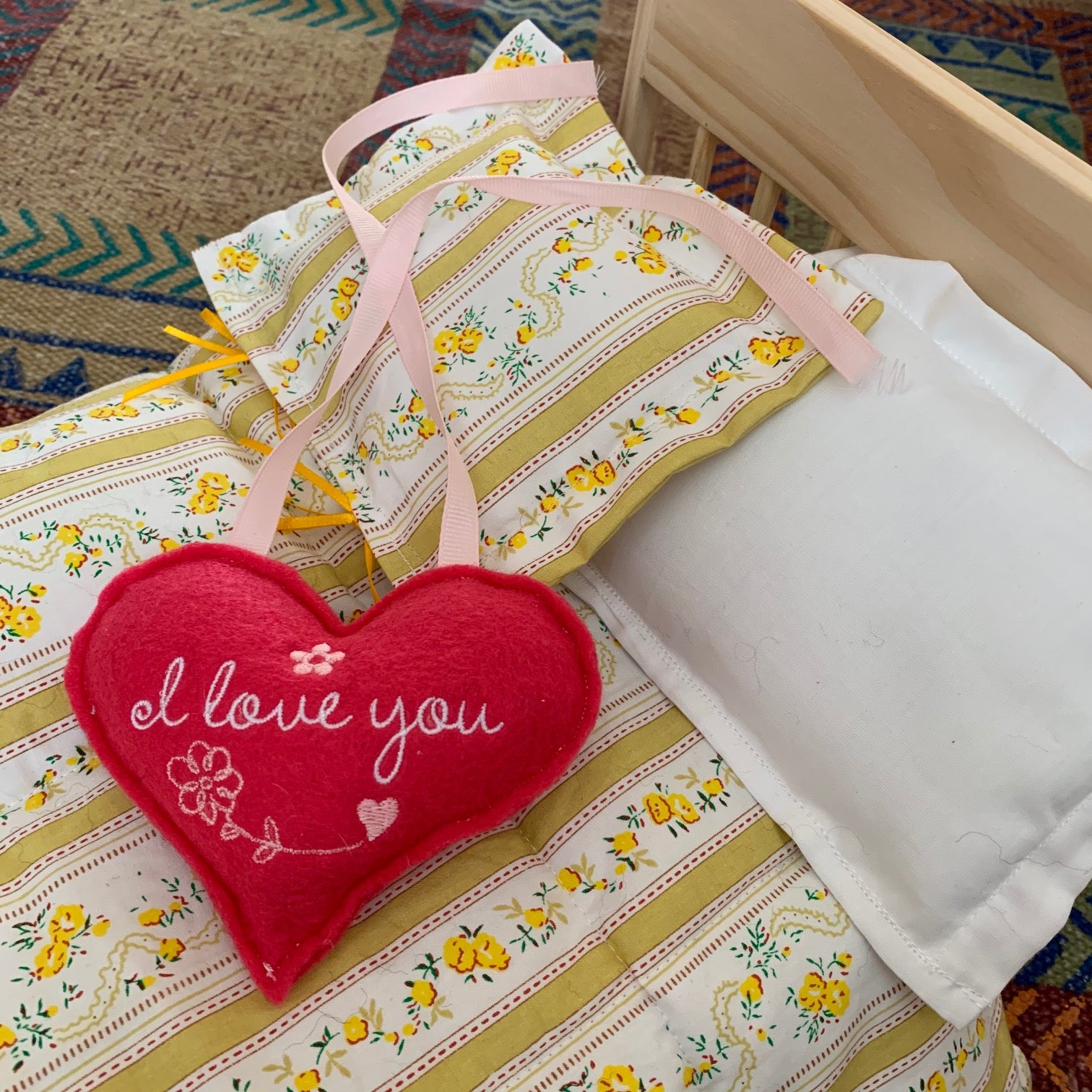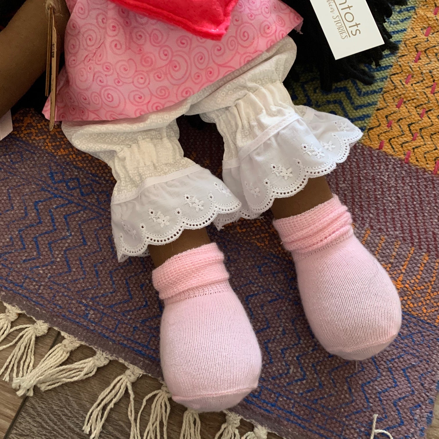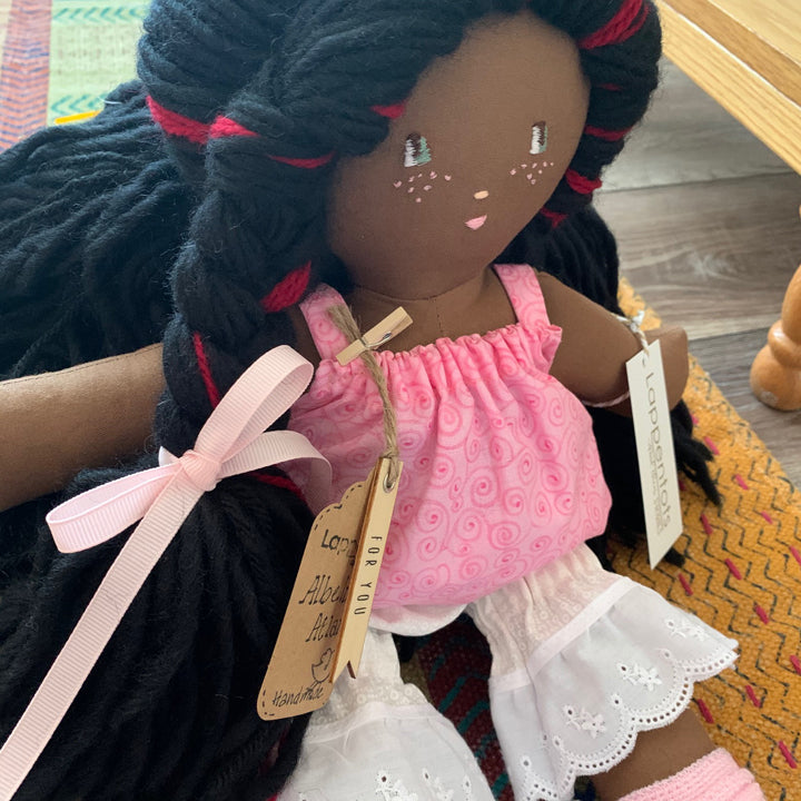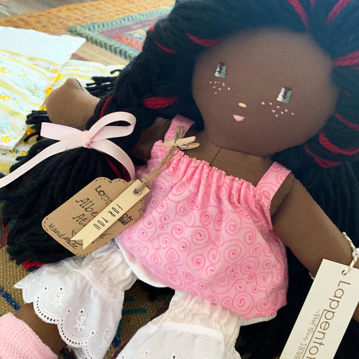 Sleepy Time Albelina Atlanté is a limited edition 15" Lappentot, who is perfectly sweet and lovable. She has hair made from sheep wool, and alpaca. She wears a pink printed top, white floral pantaloons, pink ruffled socks. She carries a woolfelt "I love you" heart.