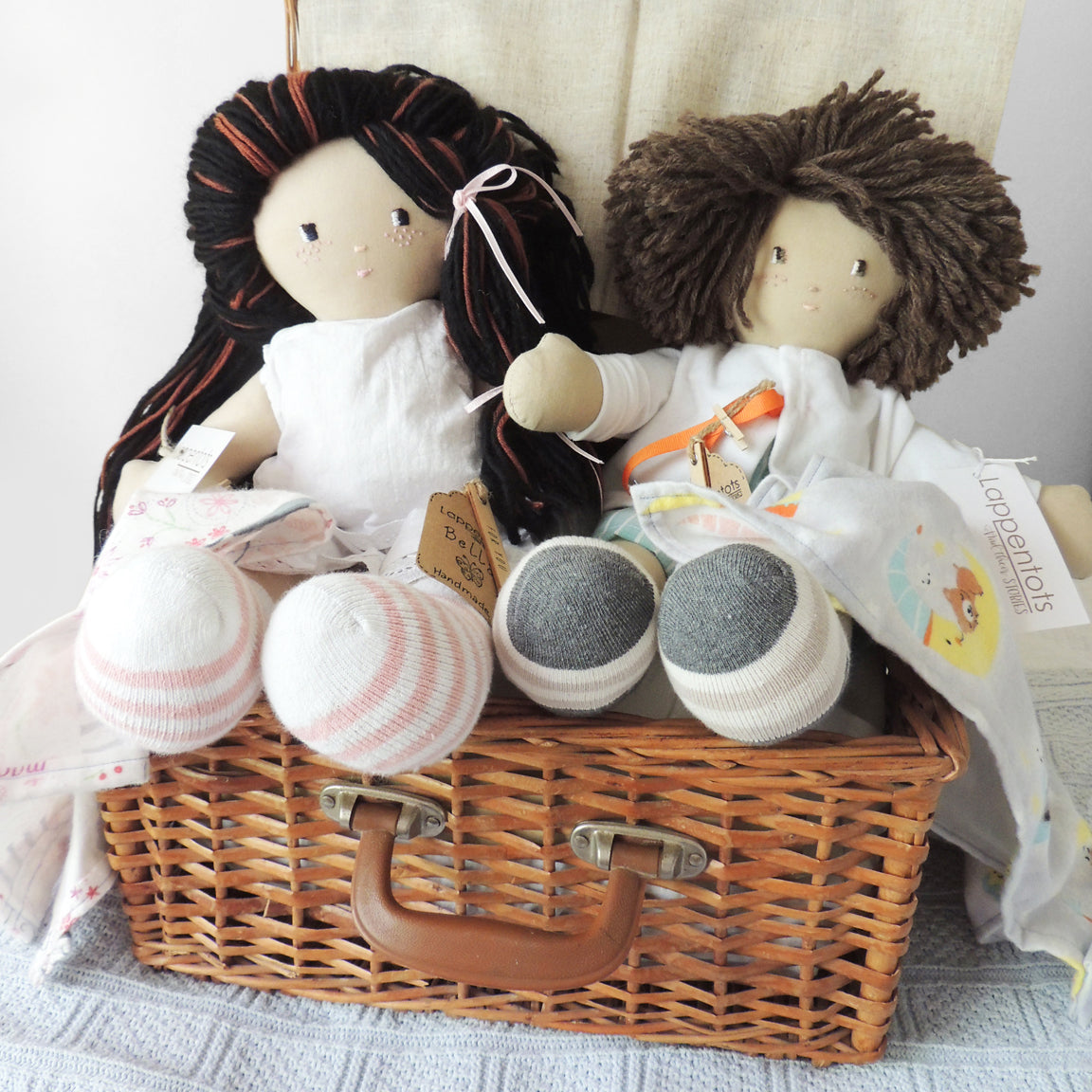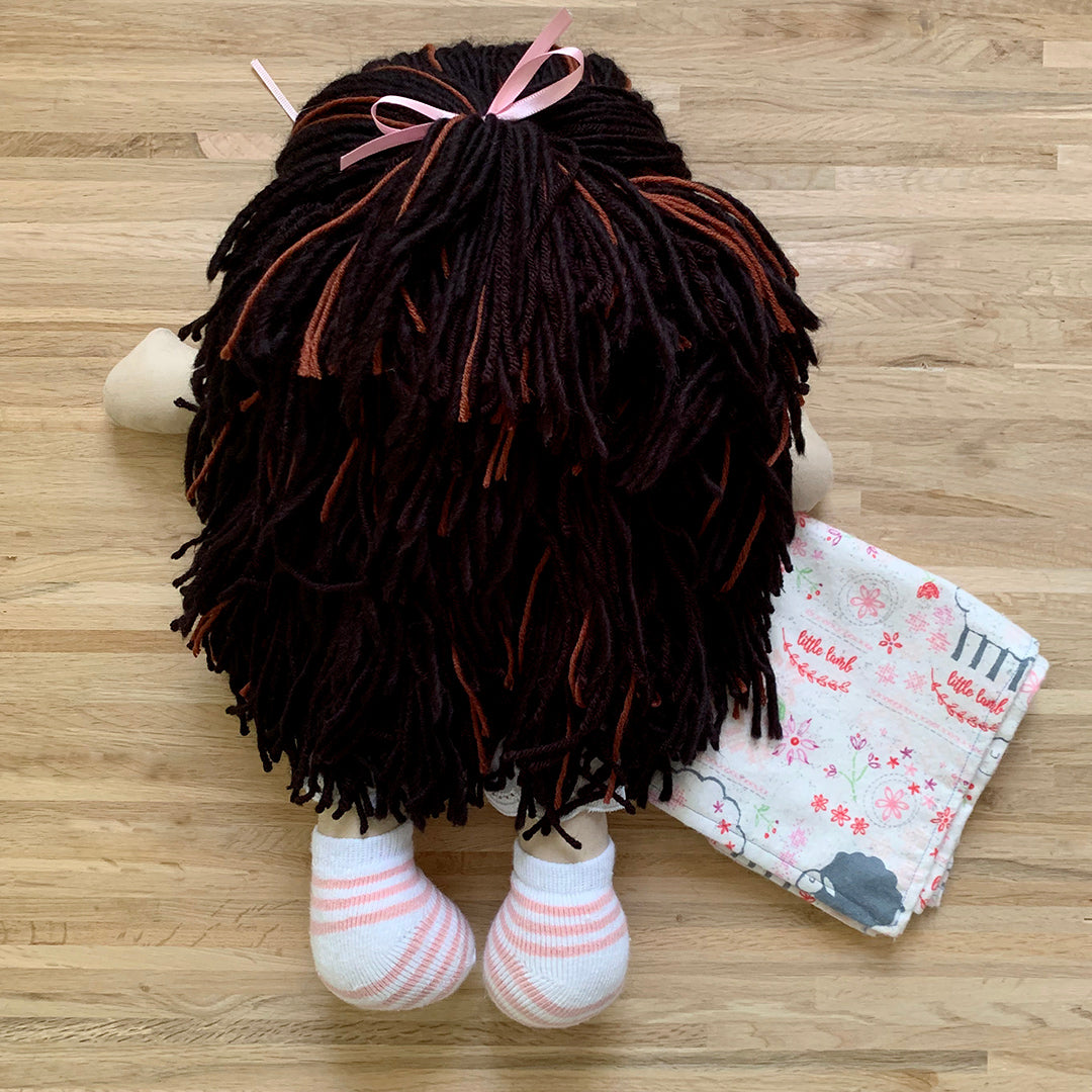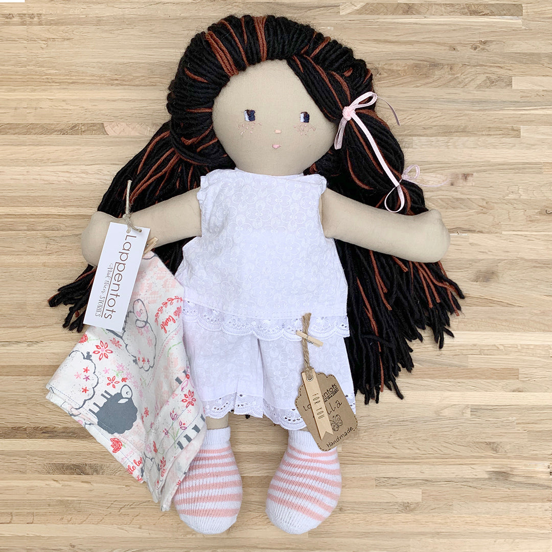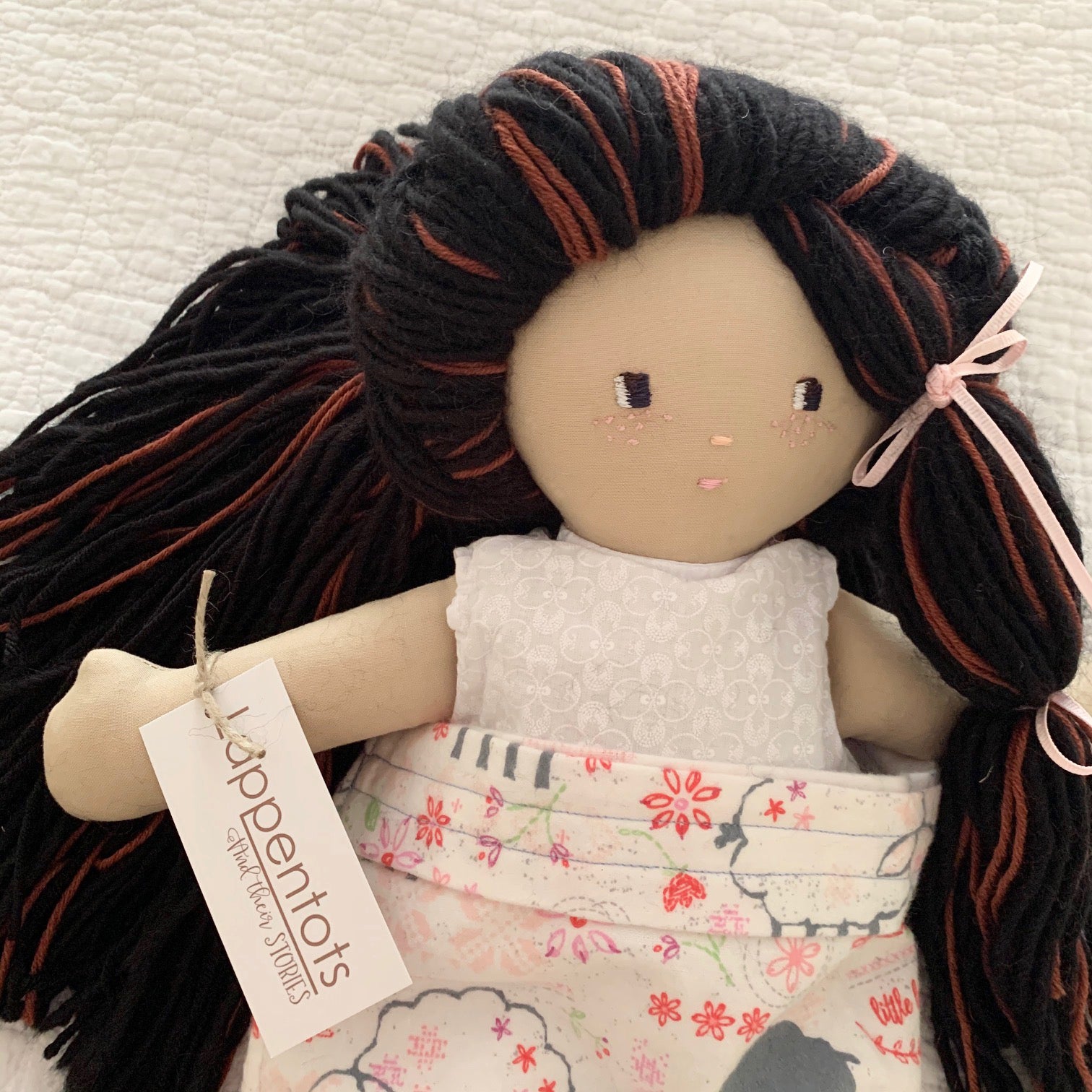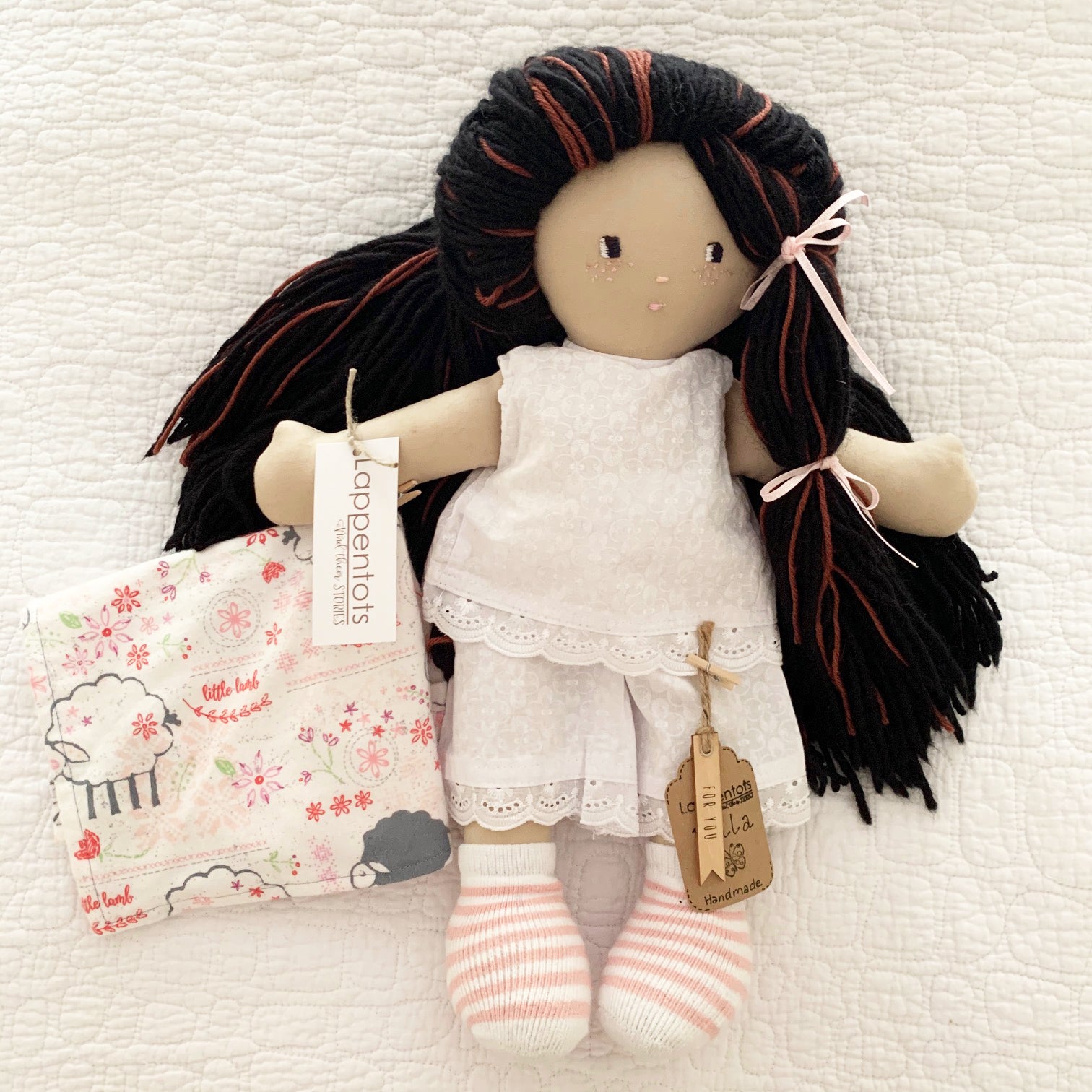 Bella Sleepy Time comes with her own brush cotton blanket, she is 15" tall, and handcrafted so no two are alike. Her body is made from cotton and filled with fiber filling. Bella's cotton clothes are hand sewn and can be removed. Her black hair with chestnut highlights is a blend of sheep and alpaca wool which is very soft to touch, she has a round cuddly tummy and is made for play.