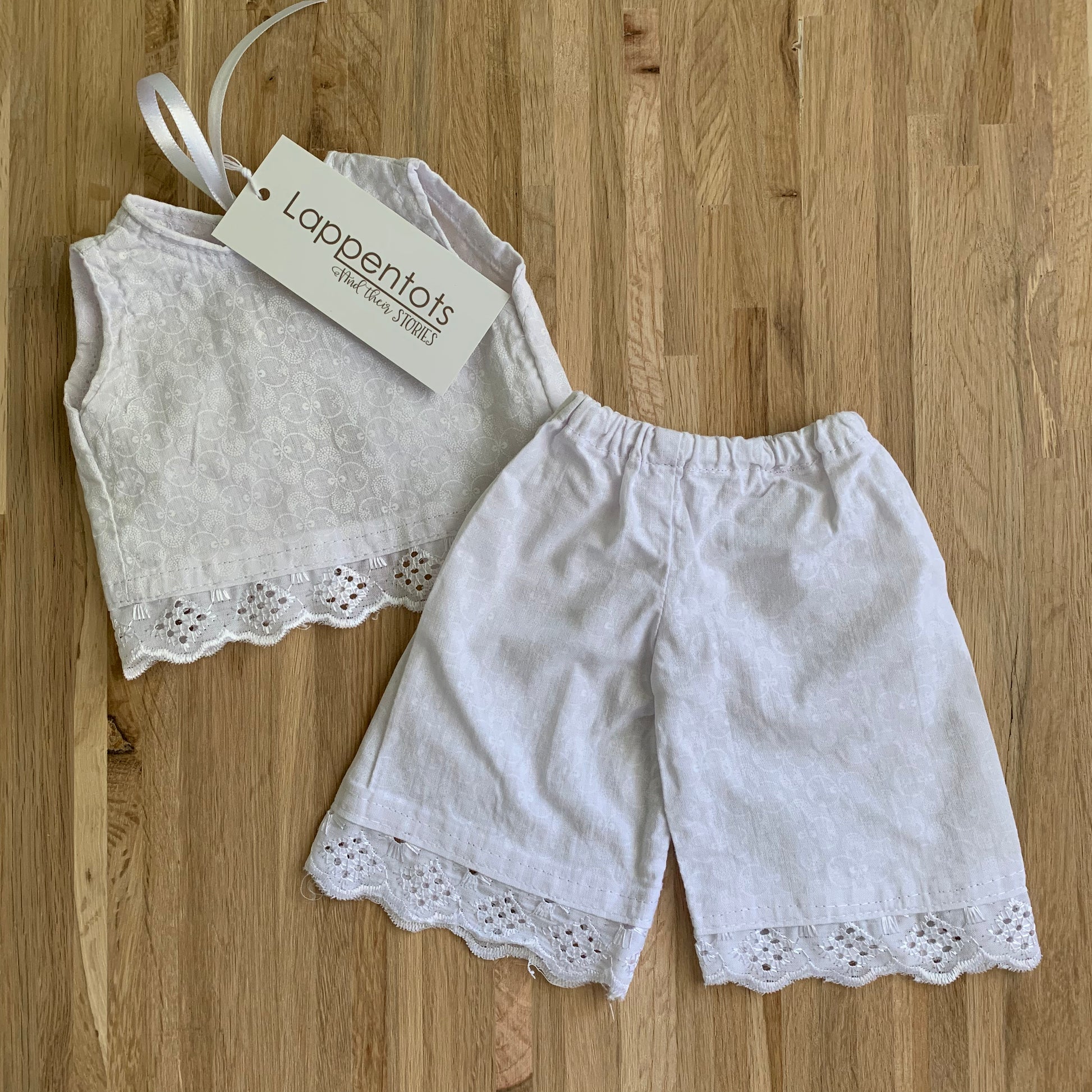 White handmade cotton floral chemisette and shorts with lace trim. Open in the back, closes with a white ribbon. Fits all 15" Lappentots.