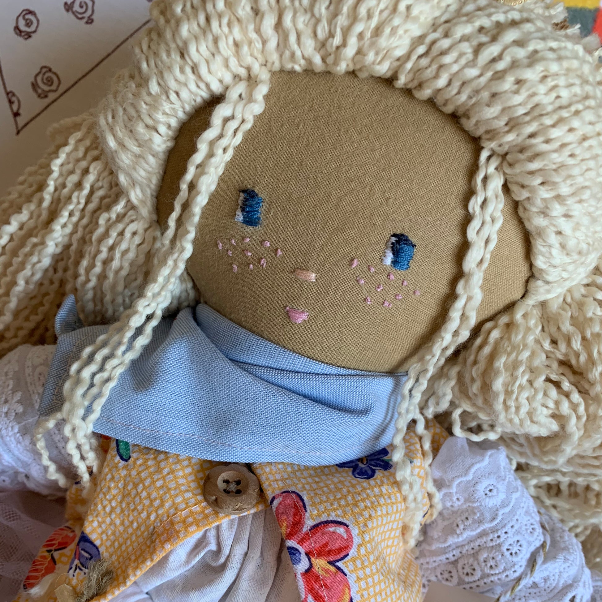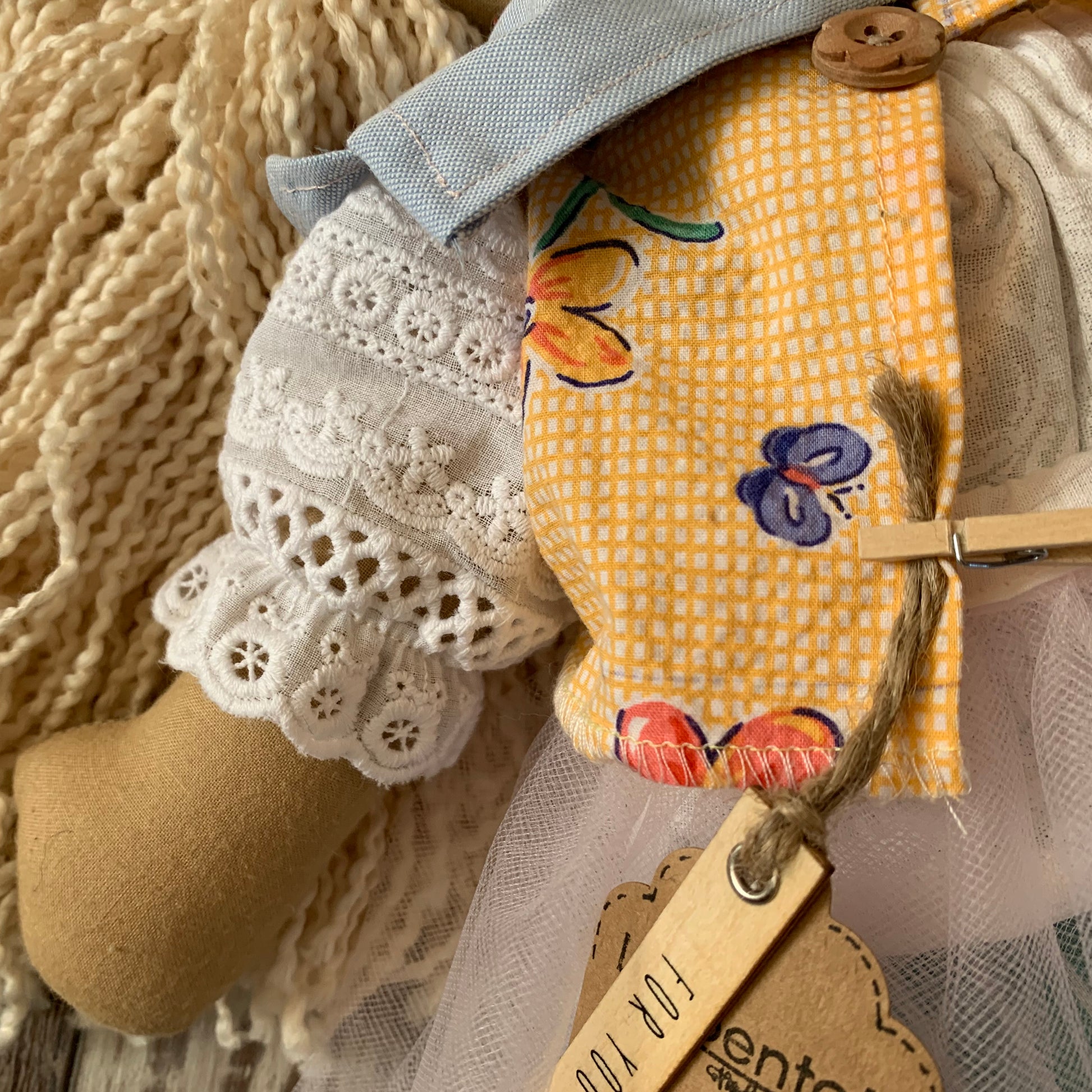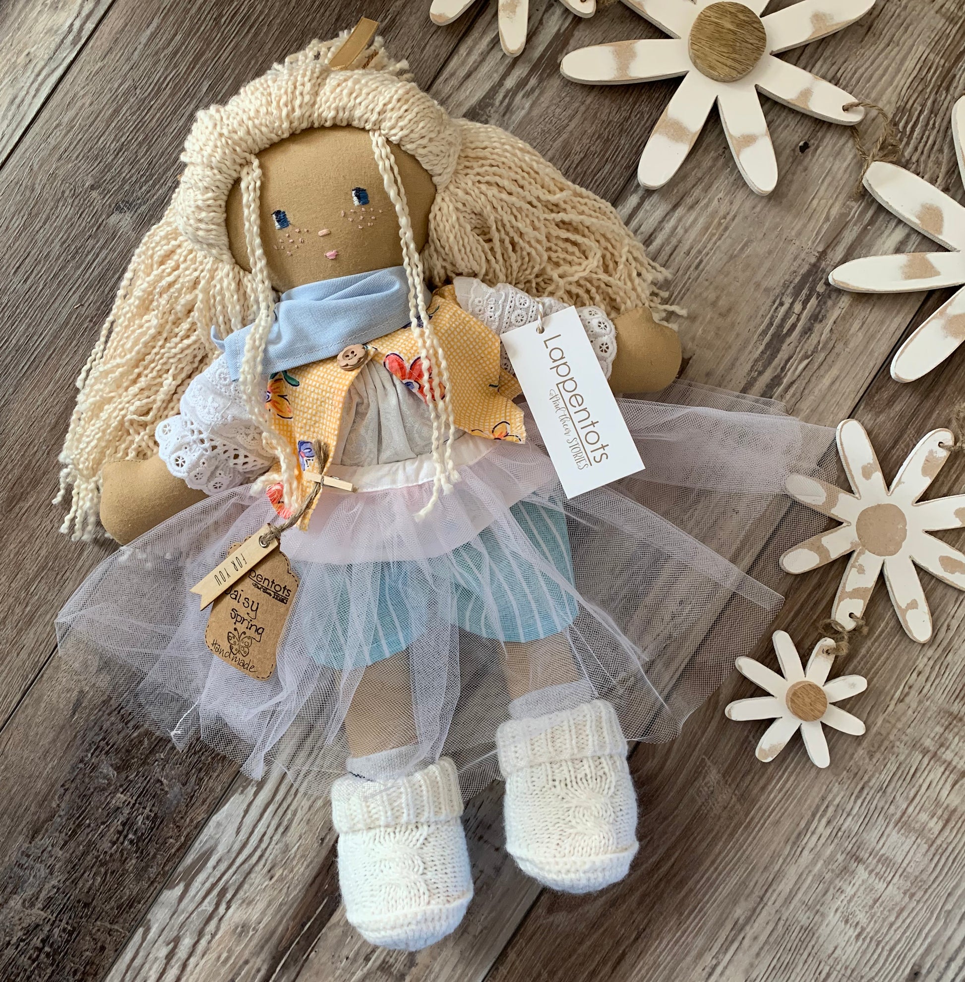 Daisy Spring is 15" tall, she is handcrafted so no two are alike. Her body is made from cotton and filled with fiber filling. Daisy Spring's cotton clothes are hand sewn and can be removed. Her soft to touch almond light hair with a twist is 100% cotton. She has a round cuddly tummy and is made for play.