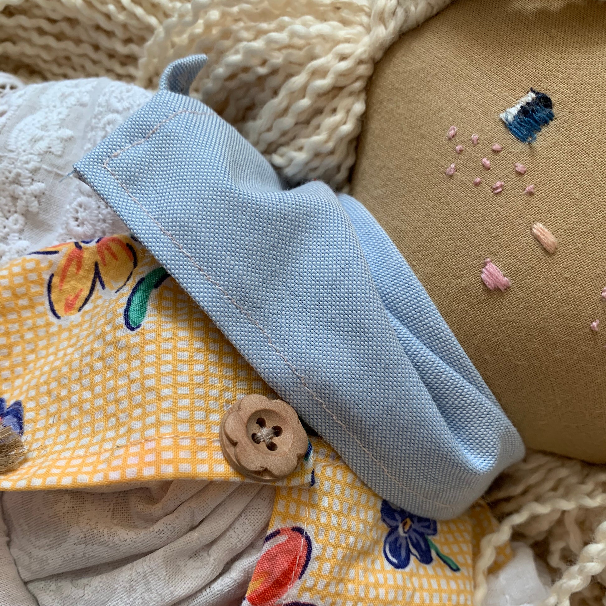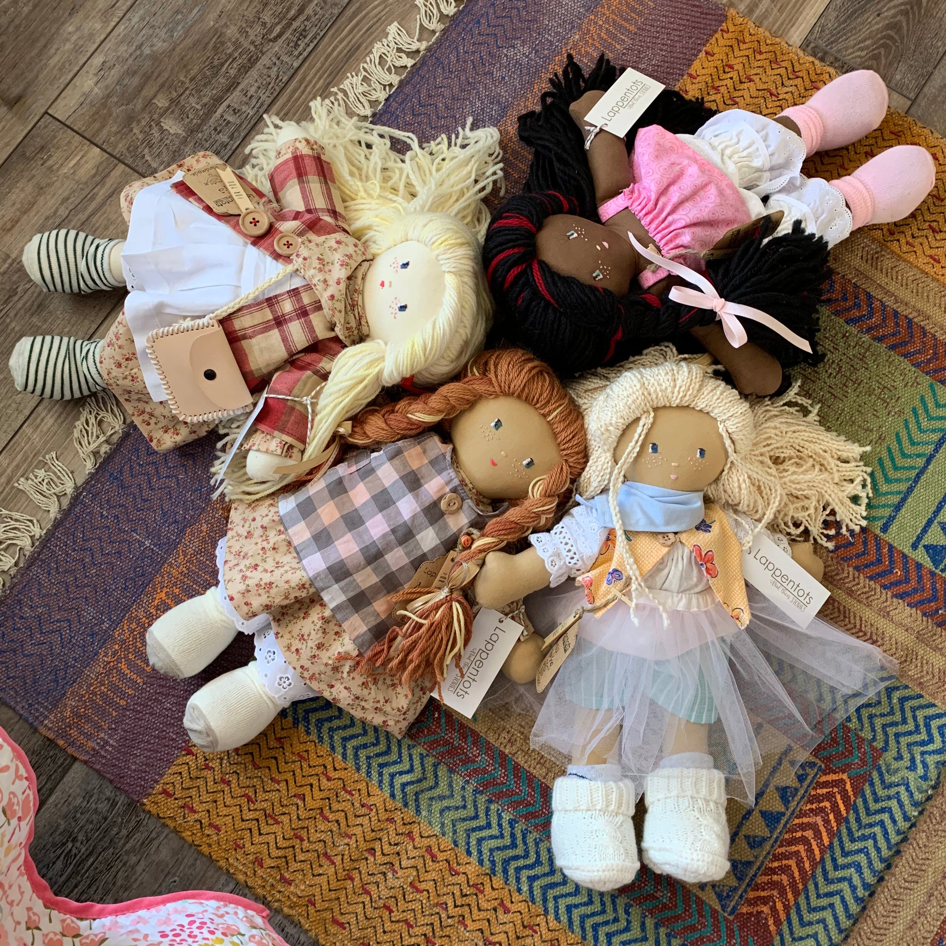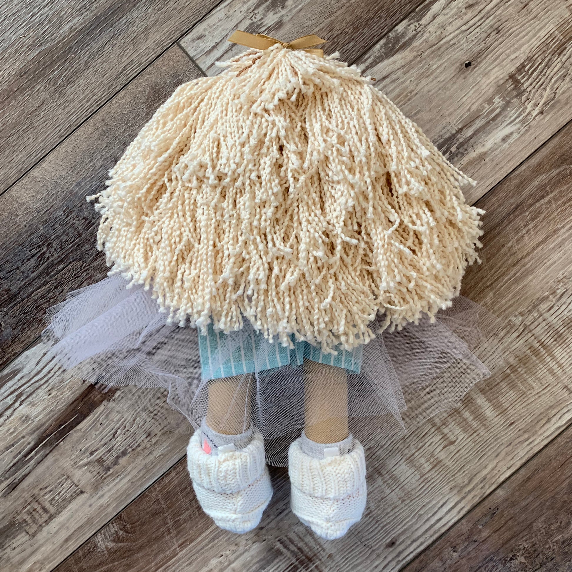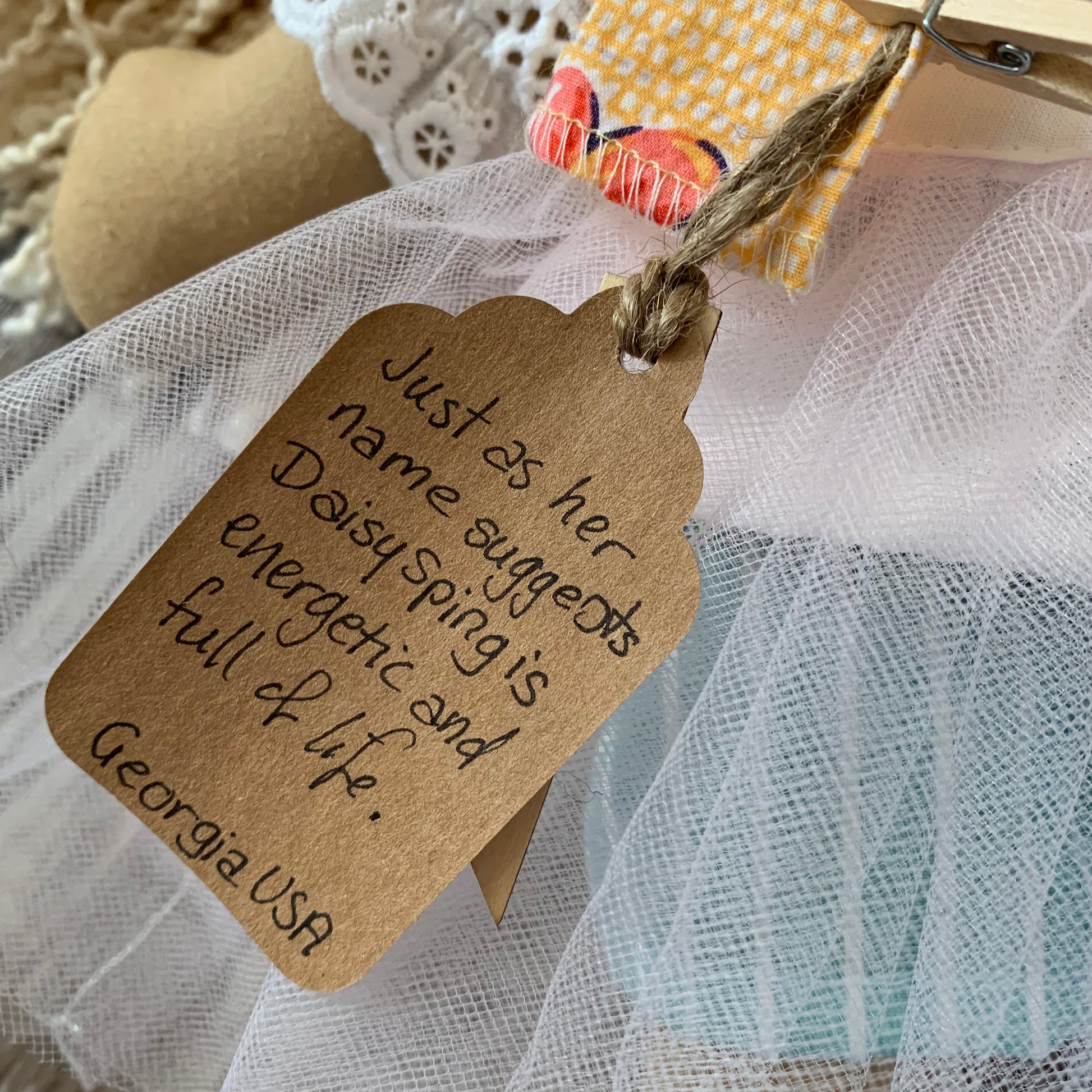 Daisy Spring is 15" tall, she is handcrafted so no two are alike. Her body is made from cotton and filled with fiber filling. Daisy Spring's cotton clothes are hand sewn and can be removed. Her soft to touch almond light hair with a twist is 100% cotton. She has a round cuddly tummy and is made for play.