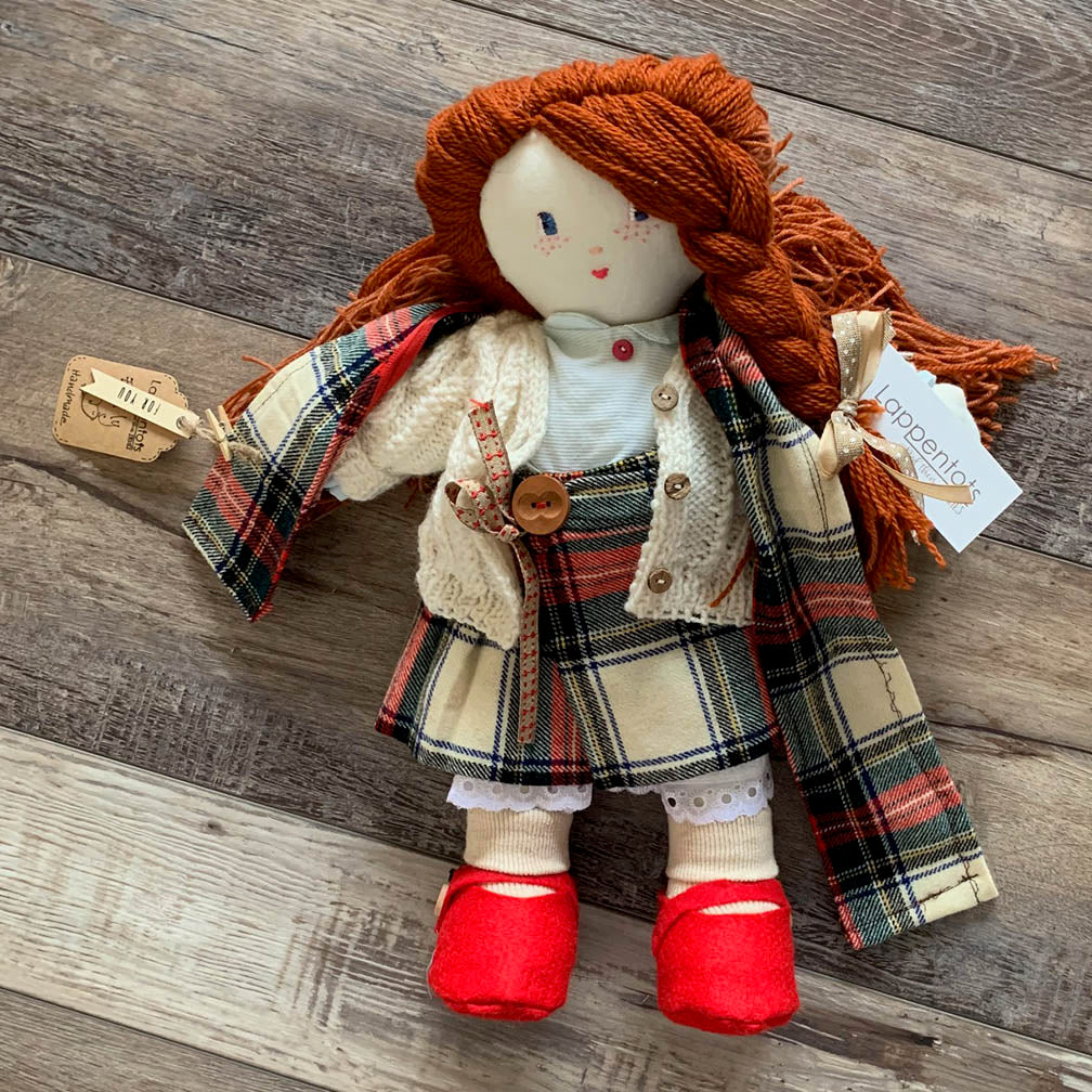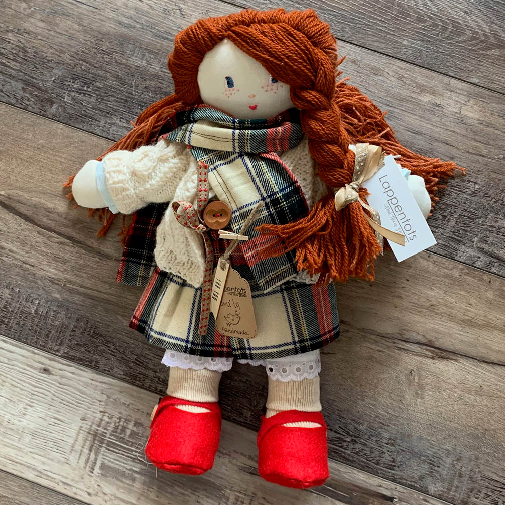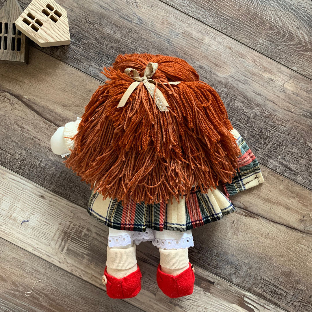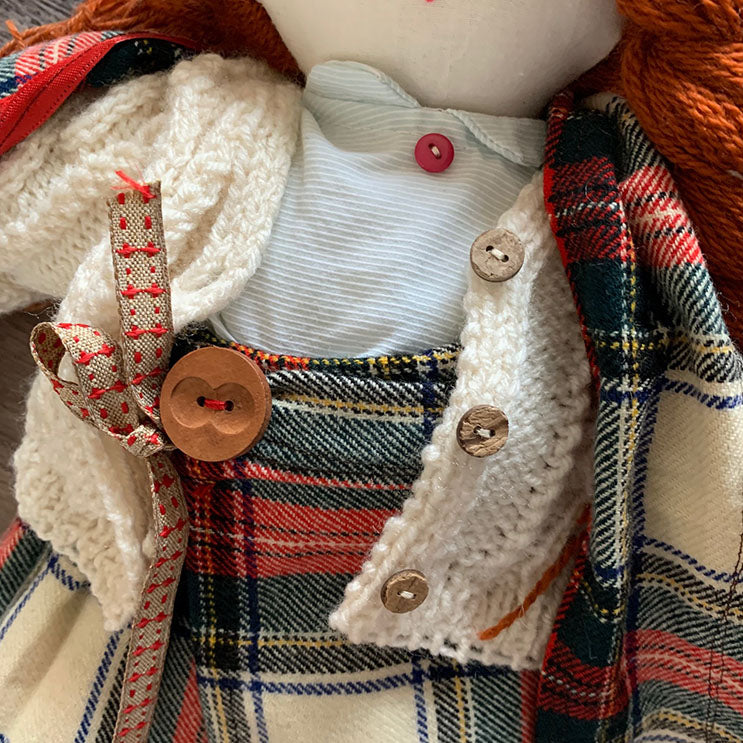 Emily is 15" tall, she is handcrafted so no two are alike. Her body is made from natural cotton and filled with fiber filling. Emily's vintage wool kilt is tied with a wooden button and ribbon, the scarf wraps around and both are hand sewn and can be removed. Her blouse and bloomers with lace are cotton, and the cardigan with buttons, is hand knitted in a traditional Scottish pattern. And look at her impressive red wool felt shoes with wooden buttons. She is ready to be loved and cuddled. Her soft to touch autumn red brown hair is a blend of Highland sheep and baby alpaca wool. She has a round cuddly tummy and is made for play.