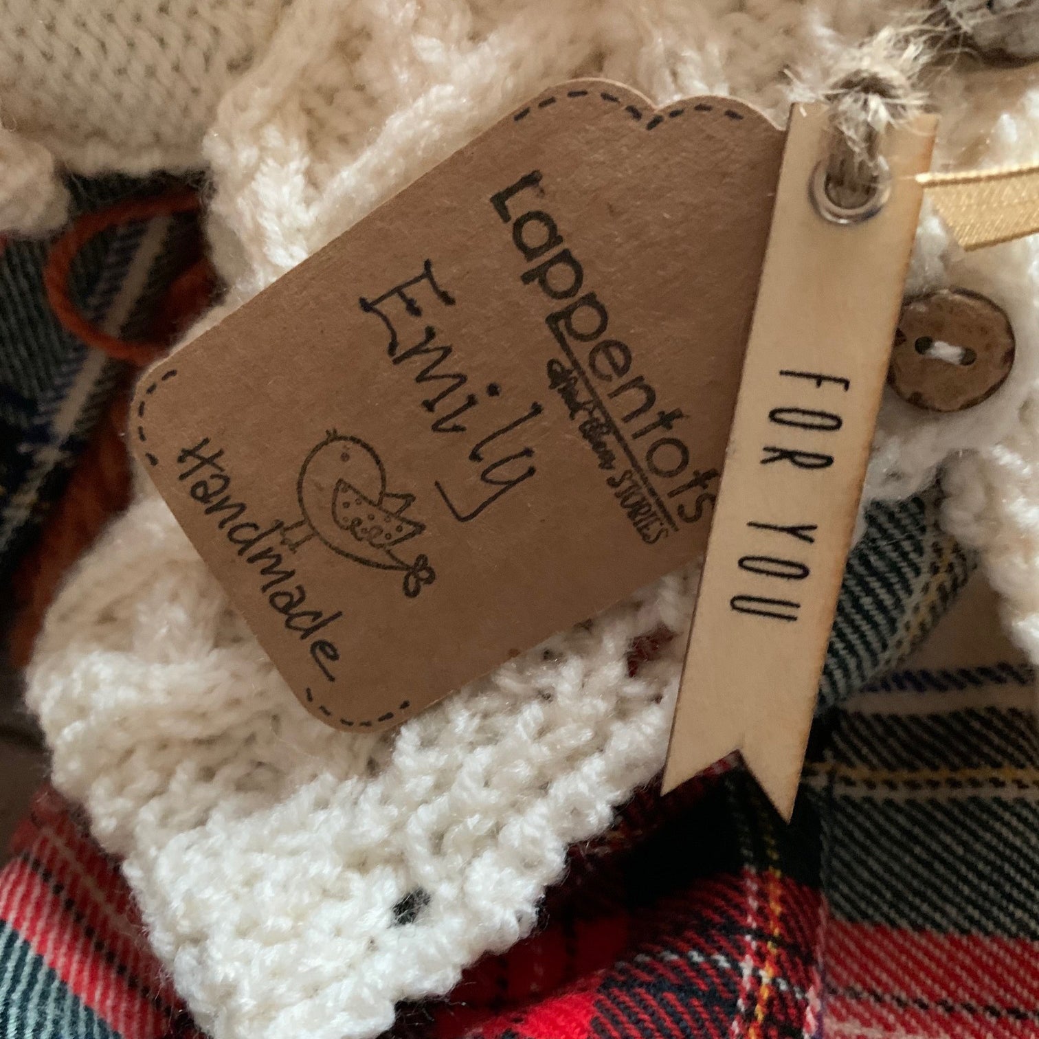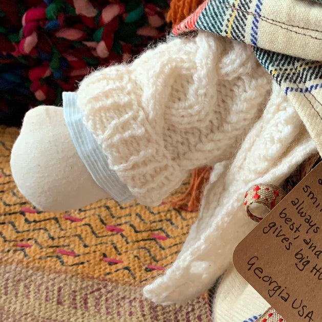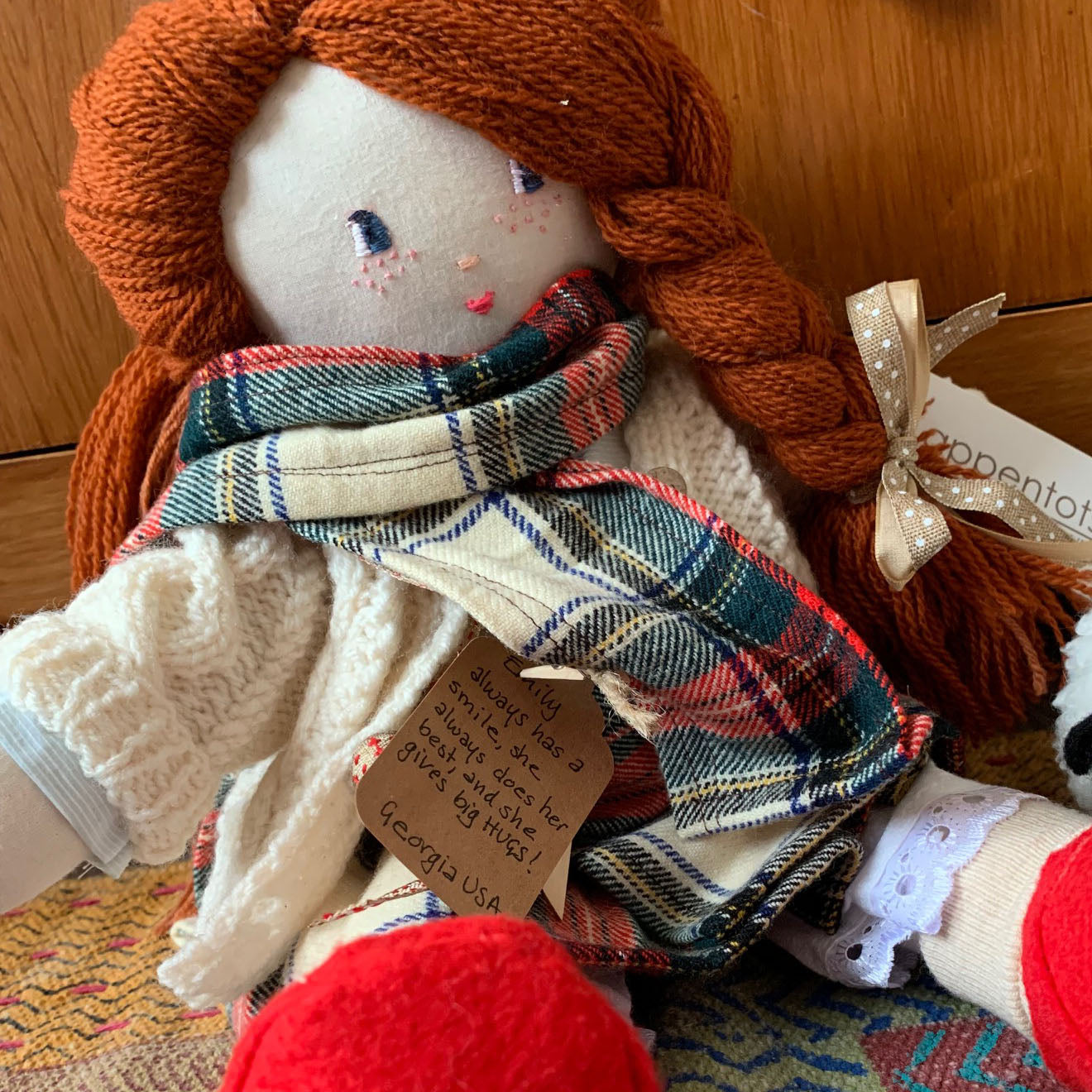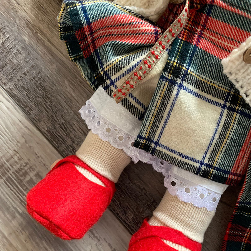 Emily is 15" tall, she is handcrafted so no two are alike. Her body is made from natural cotton and filled with fiber filling. Emily's vintage wool kilt is tied with a wooden button and ribbon, the scarf wraps around and both are hand sewn and can be removed. Her blouse and bloomers with lace are cotton, and the cardigan with buttons, is hand knitted in a traditional Scottish pattern. And look at her impressive red wool felt shoes with wooden buttons. She is ready to be loved and cuddled. Her soft to touch autumn red brown hair is a blend of Highland sheep and baby alpaca wool. She has a round cuddly tummy and is made for play.