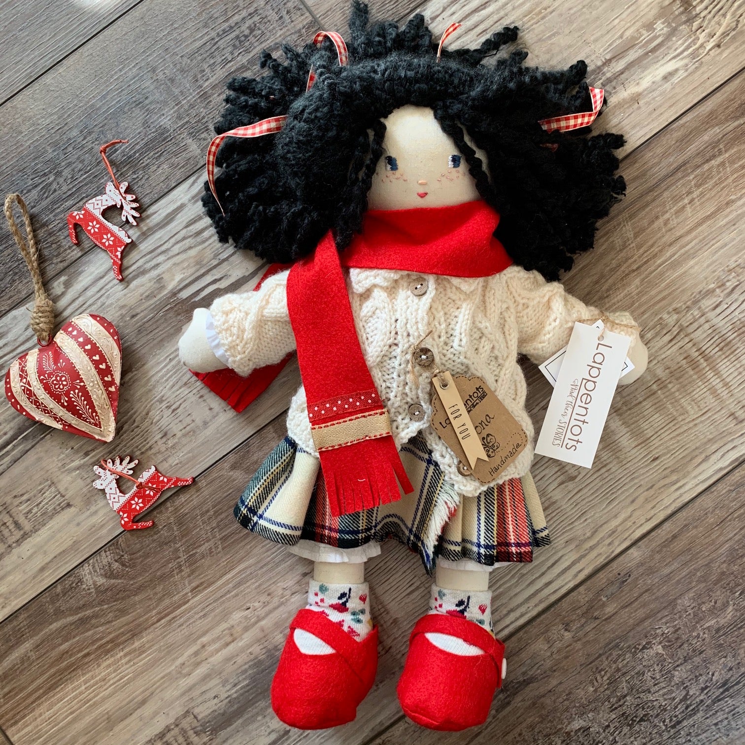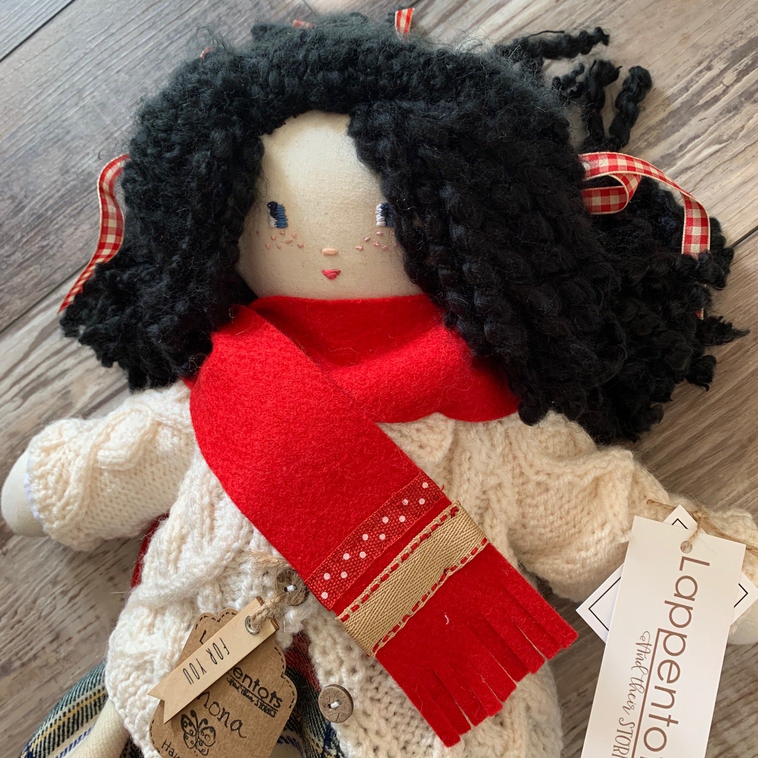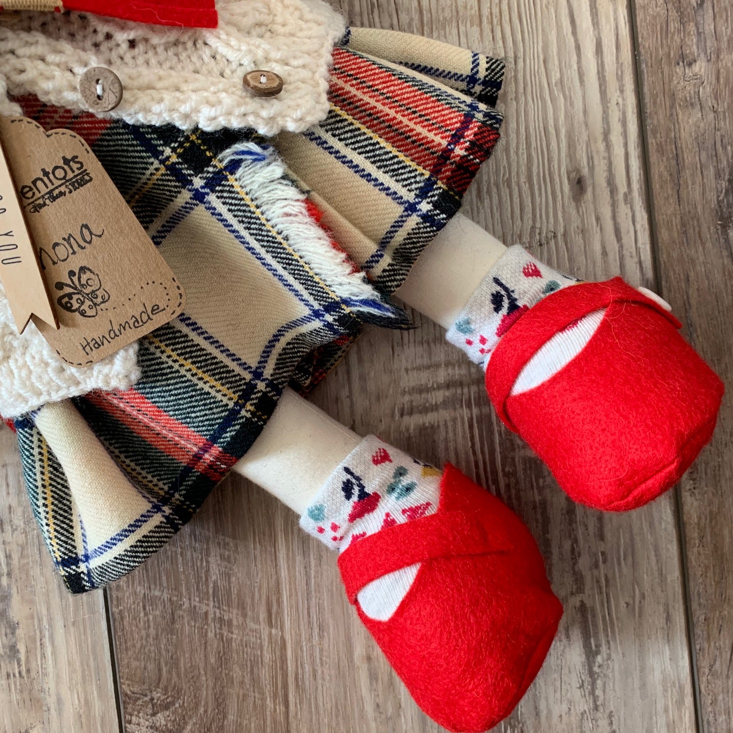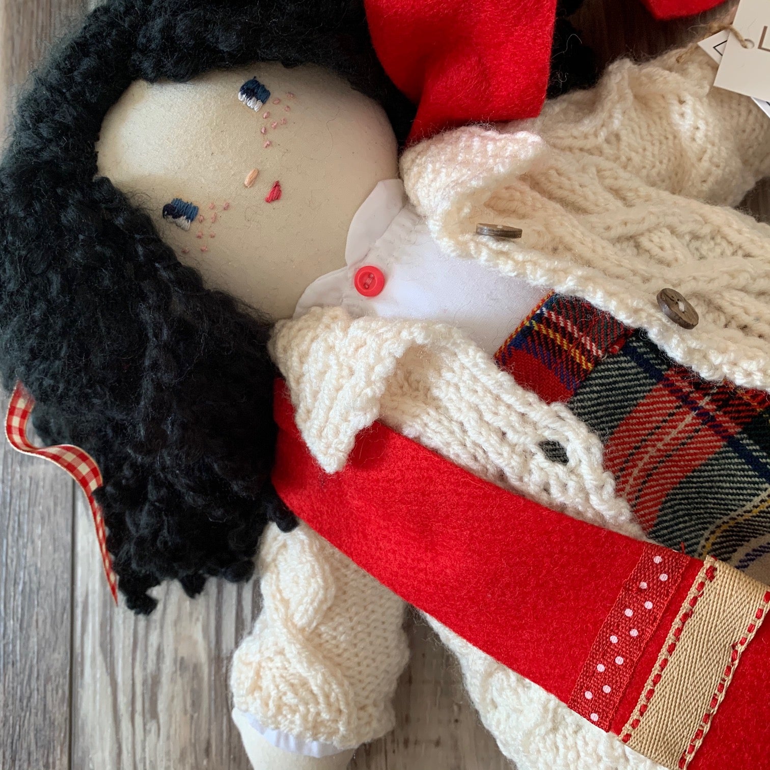 Wee Shona is 15" tall, she is handcrafted so no two are alike. Her body is made from natural cotton and filled with fiber filling. Her clothes are hand sewn and can be removed. (White cotton puffy sleeved shirt with a button, hand knitted traditional Scottish patterned cardigan, pure wool kilt made from a vintage Scottish kilt, white lace bloomers, floral socks, wool felt red shoes vintage mother of pearl buttons and a red wool felt scarf). Her soft to touch black hair is a blend yarn. She has a round cuddly tummy and is made for light play.