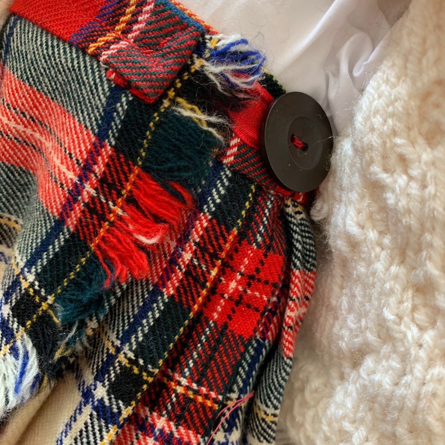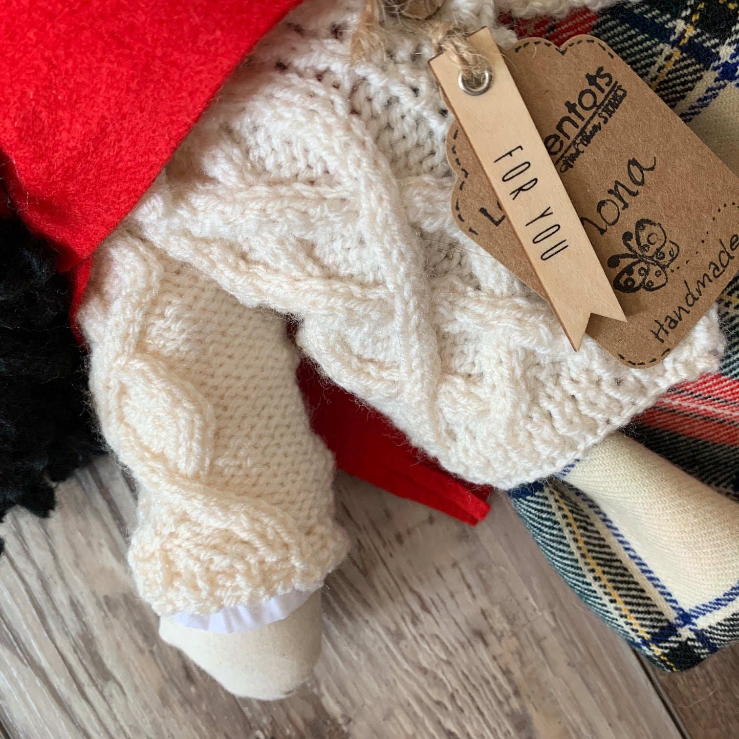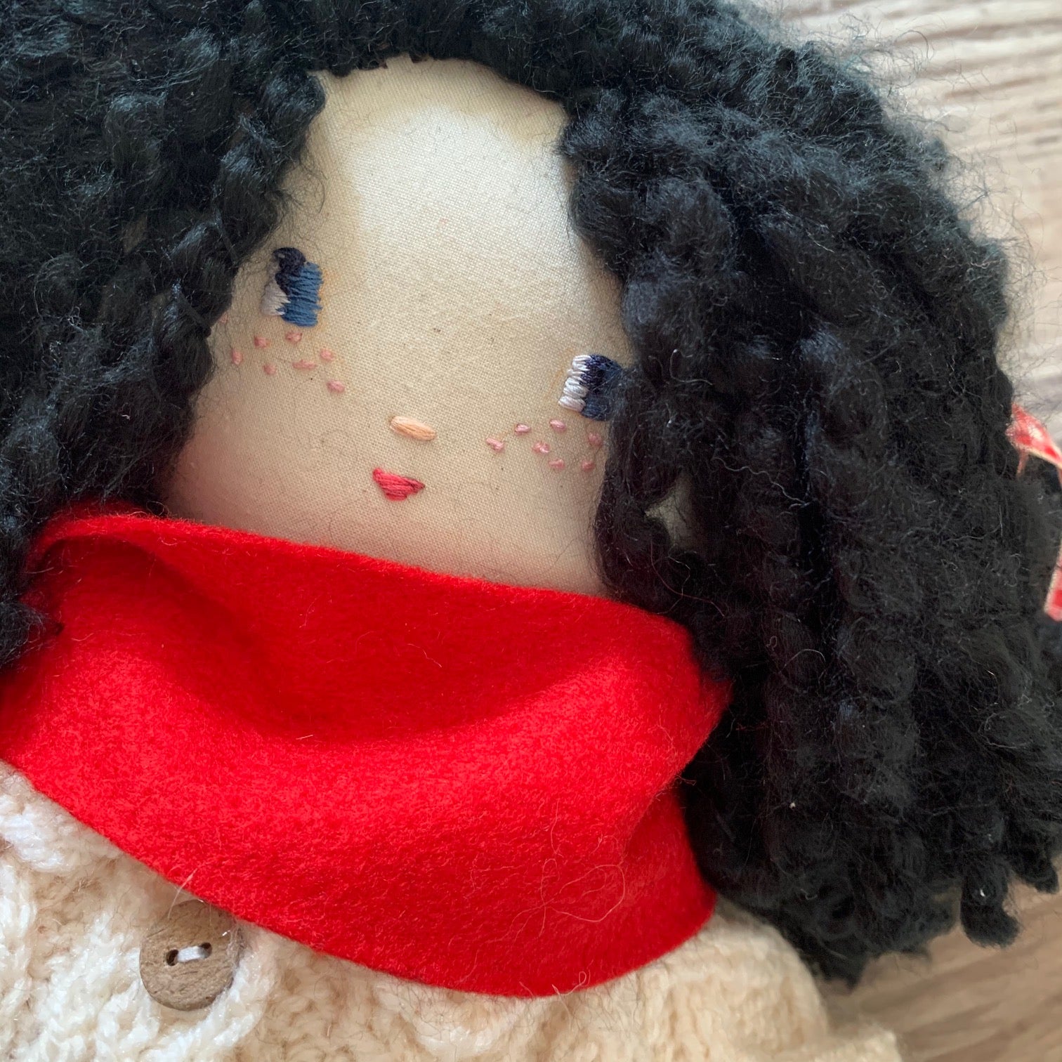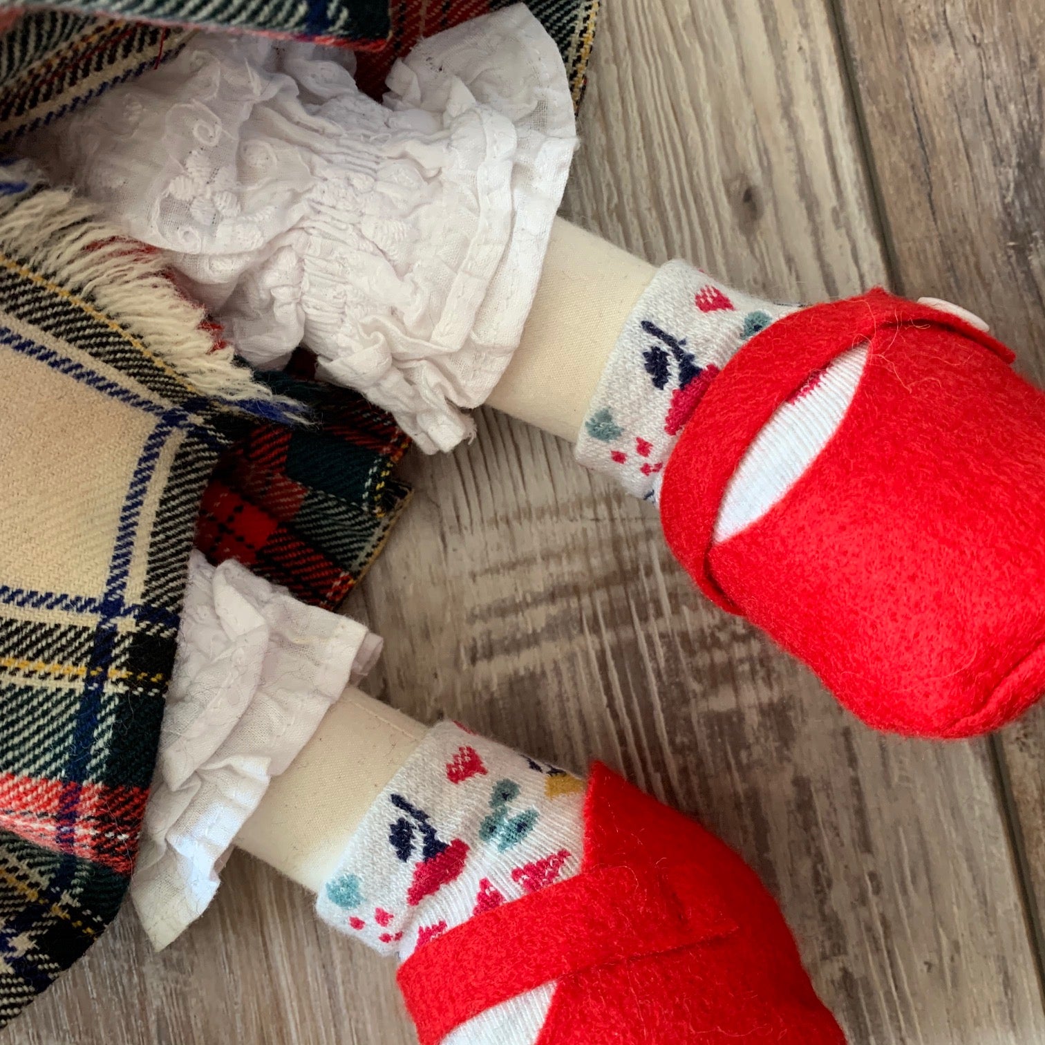 Wee Shona is 15" tall, she is handcrafted so no two are alike. Her body is made from natural cotton and filled with fiber filling. Her clothes are hand sewn and can be removed. (White cotton puffy sleeved shirt with a button, hand knitted traditional Scottish patterned cardigan, pure wool kilt made from a vintage Scottish kilt, white lace bloomers, floral socks, wool felt red shoes vintage mother of pearl buttons and a red wool felt scarf). Her soft to touch black hair is a blend yarn. She has a round cuddly tummy and is made for light play.