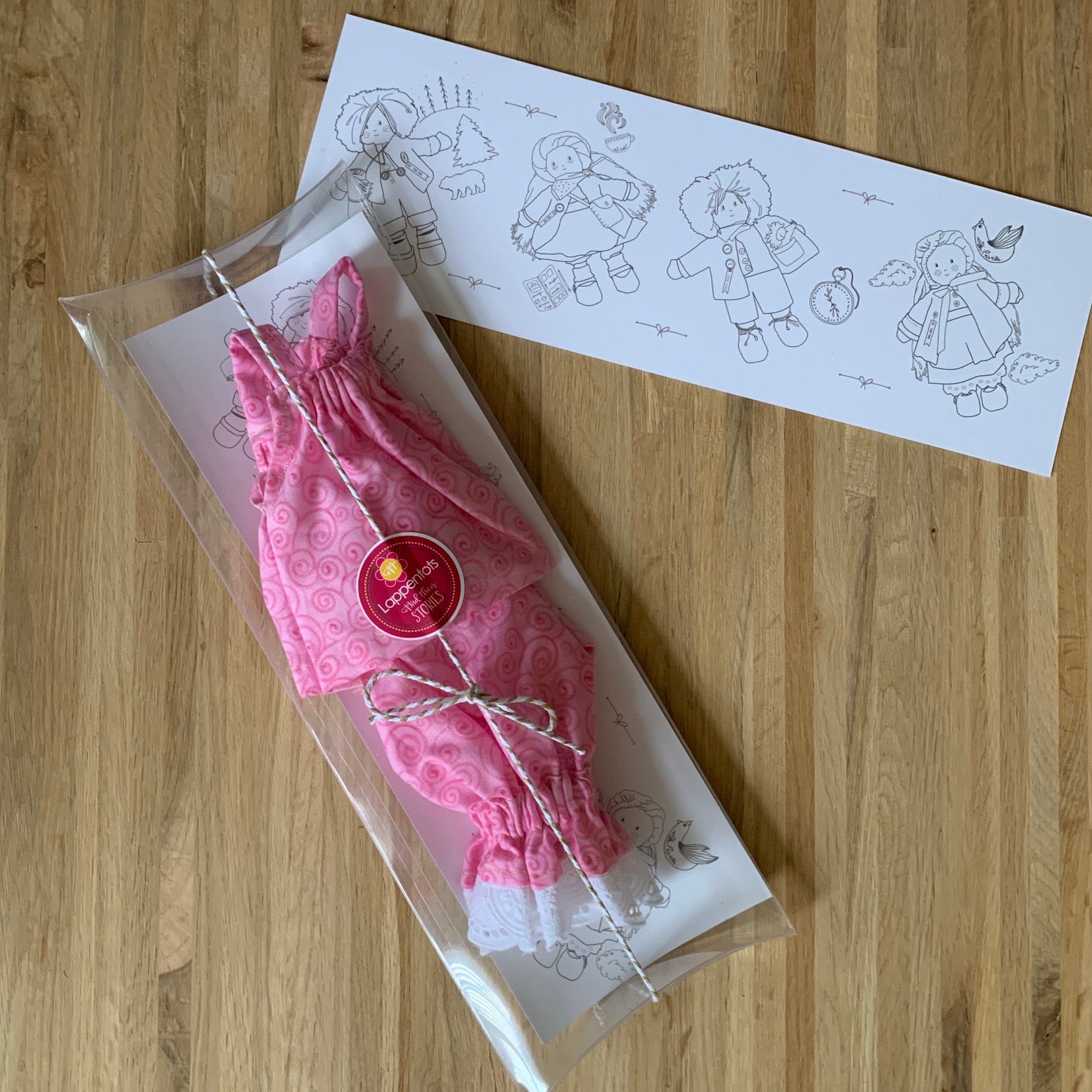 Bright pink fabric with light pink swirls is used to create this pantaloon set. The top has pink straps and the bottoms have white lace ruffles.